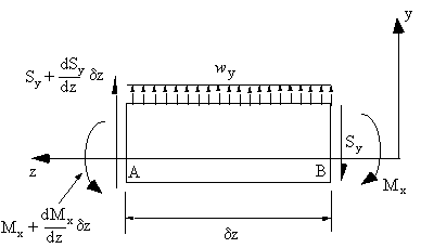 $$ Σ M_A = 0 = ( M_x + {∂ M_x}/{∂z} δz) - S_y δz + w_y {δz^2}/2 - M_x $$dividing by δz and in the limit as δz → 0 , this equation simplifies to :