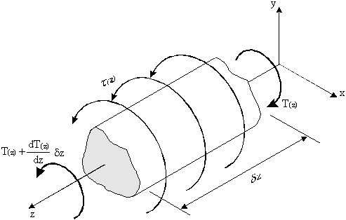 $${∂^2 M_y} / { ∂ z^2} = {∂ S_x}/{∂ z} = -w_x$$Consider now an element of length δz from a beam with an unsymmetrical cross section with only an applied torque (τ(z)) about z-axis, Figure 22.