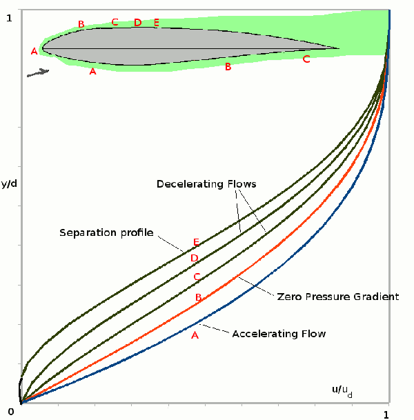 Boundary layer shapes will then appear as shown in the following figure and will depend on their location along the section and the local pressure gradient (velocity gradient).