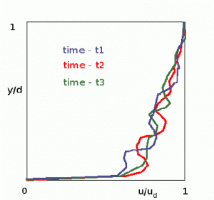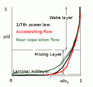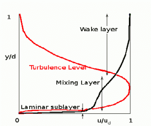 The time average profile is itself rather complex with three distinct regions. At the bottom very close to the surface, is a laminar sublayer which is stable due to the low velocity but has a high shear. At the edge near the invisicid external flow is turbulent decay layer or wake like region and joining these two in the middle is a highly turbulent mixing layer.