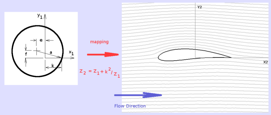 A simple mapping which produces a family of elliptical shapes and streamlined aerofoils s the Joukowski mapping. The 2-D cylinder ( $ z_1 $ flow field) is mapped to a streamlined shape ( $ z_2 $ flow field) using the mapping.