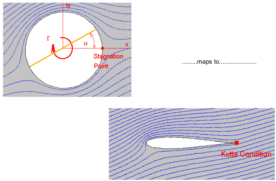 For streamline shapes with sharp trailing edges, such as Joukowski aerofoil sections, circulation must be added to the flow to obtain the correct lifting solution. The value of circulation applied to the cylinder in flow field $z_1$ should be specified so that a stagnation point is produced at the point of intersection of the rear of the cylinder and the x-axis.
