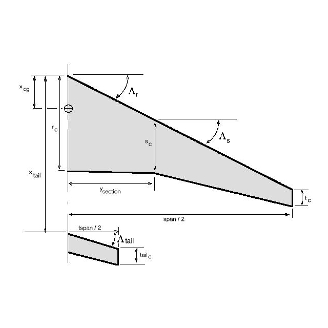 | Vortex Lattice Method Calculations This script calculates the aerodynamic properties of a three-dimensional wing in potential flow. The planform geometry of the wing and a tailplane can be specified for cases of symmetric wing loading about the center-line. Aerofoil section CL properties are assumed to be linear with a d(CL)/d(α) gradient of 2π. Camber effects can be introduced by setting a zero lift angle, α0, for each section. The wing can be divided into two connected zones by including a mid-span location "y(section)". If this location is not specified (ie y=0.0) then a single zone is created from wing root to tip. Similarly if no tail location is input, this component will be dropped from the calculation. | |||